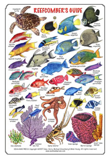 | Reefcomber’s Guide combines 75 colorful, frequently seen fishes, invertebrates and turtles of the Tropical Atlantic. 6 X 9.5” | ||||||||||||||||||||||||||||