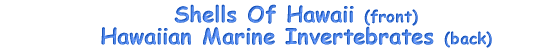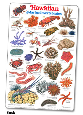 32 Hawaiian shells (front) and 31 marine invertebrates (back) reveal the infinite variety of creatures without backbones. These mollusks, crustaceans, soft and stony corals, sea urchins and sea stars are found in Hawaii and other Pacific locations. Credit card plastic 6 x 9.5”