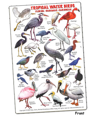 51 birds seen in the wetlands, swamps, mangroves and shorelines of Florida, Bahamas and the Caribean are depicted in all their splendor. Many diagnostic characteristics are unique to this Field Guide: All birds are shown full-figure, revealing feet often important for identification. Many of these birds are seen throughout the world during migration. Credit card plastic 6 x 9.5” |