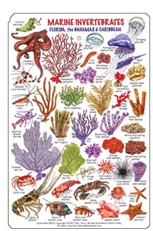 | Guide depicts 89 animals without backbones, including crustaceans, stony corals, soft corals, sponges, jellyfish, mollusks and more. | ![]() |