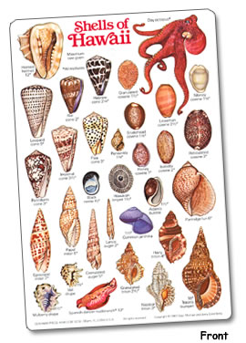 32 Hawaiian shells (front) and 31 marine invertebrates (back) reveal the infinite variety of creatures without backbones. These mollusks, crustaceans, soft and stony corals, sea urchins and sea stars are found in Hawaii and other Pacific locations. Credit card plastic 6 x 9.5”